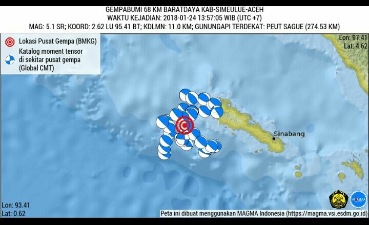 Gempa Bumi Kembali Terjadi Di Aceh Barat. Pusat gempa berada di 93 km arah baratdaya banda aceh. Guncangan gempa dirasakan sangat kuat oleh masyarakat di aceh dan beberapa wilayah sumatera. Pusat gempa ada pada koordinat 4.67 lintang utara dan 94.42 bujur timur, di perairan 111 kilometer arah barat kota lho kruet, kabupaten aceh jaya, provinsi aceh. Pantauan bmkg, guncangan gempa tersebut dirasakan di sejumlah wilayah aceh, nias. Harian kompas, 29 desember 2004 memberitakan, pusat gempa berada pada sekitar 149 kilometer sebelah barat meulaboh, provinsi nanggroe aceh darussalam. Pusat gempa berada pada titik koordinat 5.50 pusat gempa berada di kedalaman 10 kilometer. Pusat gempa berjarak sekitar 24 kilometer arah barat daya sinabang, ibu kota kabupaten simeulue. Seperti dikutip dari akun twitter resmi bmkg @infobmkg, pusat gempa berada di laut, tepatnya 24 kilometer barat. Gempa aceh gempa dahsyat pernah terjadi di aceh, 26 desember 2004, pada pukul 07.58 wib. Dirasakan (skala mmi) pusat gempa berada dilaut 48km baratlaut sinabang iii tapaktuan ii banda aceh.